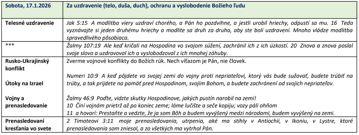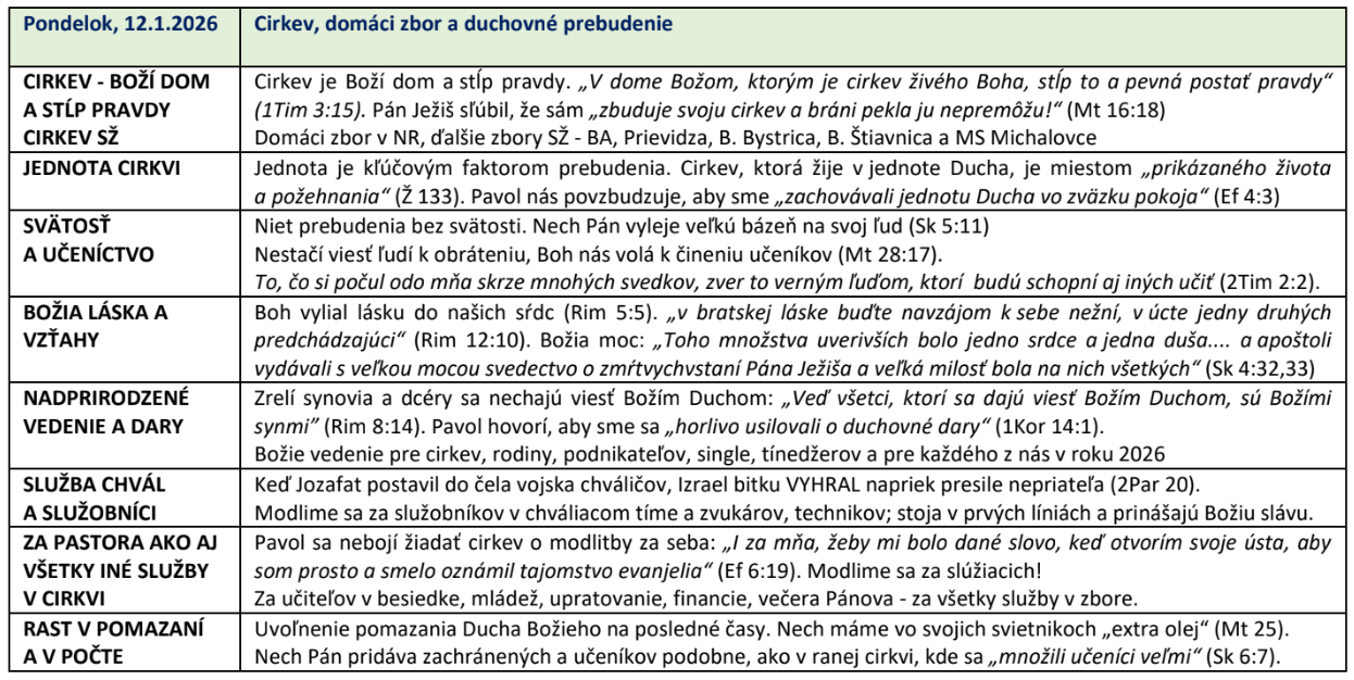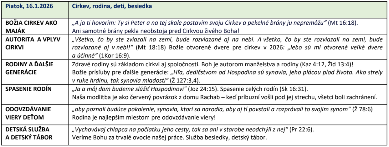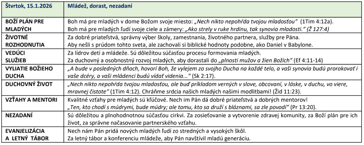 Témy modlitebných stretnutí na jednotlivé dni: